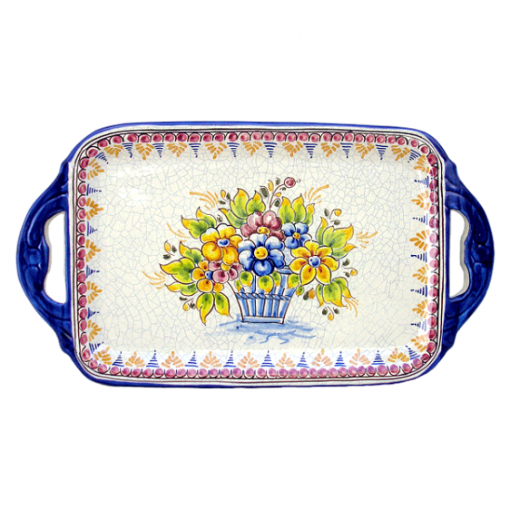 Bandeja de asas rectangular decorada con grecas y flores. Baño con efecto cuarteado.